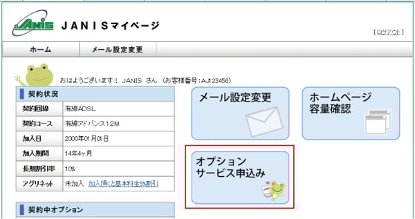 ログイン後に表示されるメイン画面内の「オプションサービス申込み」ボタンをクリックしてください。