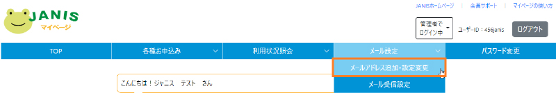 JANISからのお知らせやメンテナンス案内、障害情報メールの受け取り設定が行えます。