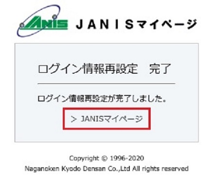 設定が完了すると以下の画面が表示されますので、「JANISマイページ」のリンクをクリックし、再度、ログインをお願いします。