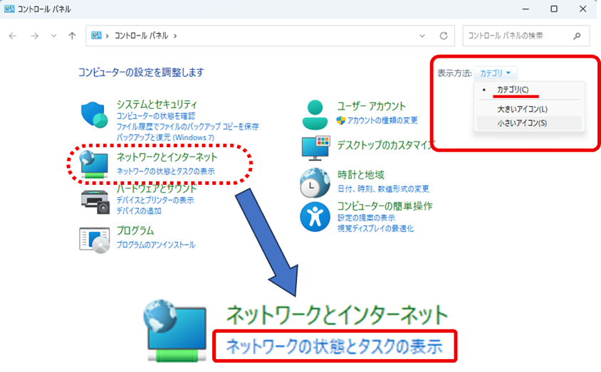 「コントロールパネル」が開いたら、表示方法を「カテゴリ」に切り替え、「ネットワークとインターネット」内の「ネットワークの状態とタスクの表示」をクリックします。