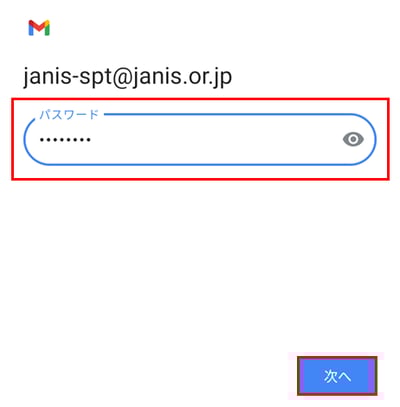 (8)「パスワード」にご利用案内通知書に記載のパスワードを入力し「次へ」をタップ