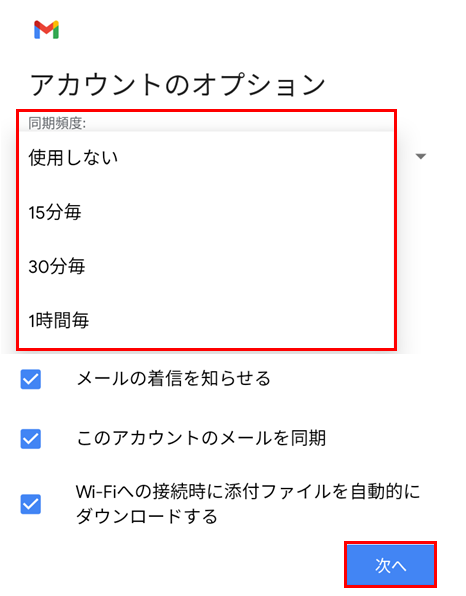 (11)「同期頻度」についていずれかを選択し「次へ」をタップ