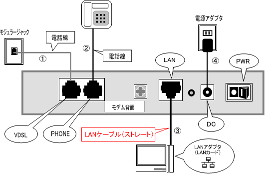 | ③ | モデム~パソコン間を、モデム同梱のLANケーブル(ストレート)で接続します。 |